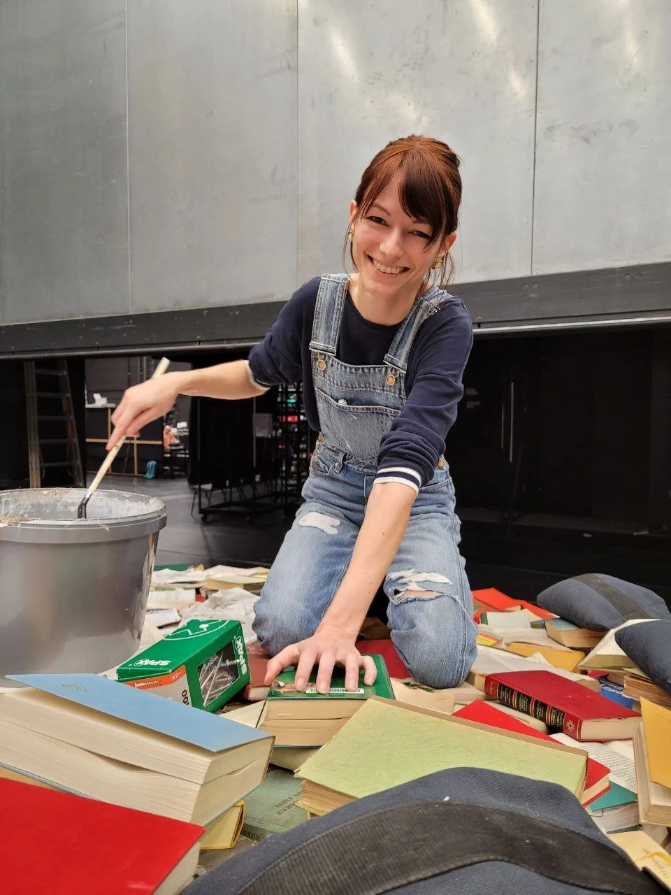 Happy Nessa gluing hundreds of books together for a set piece